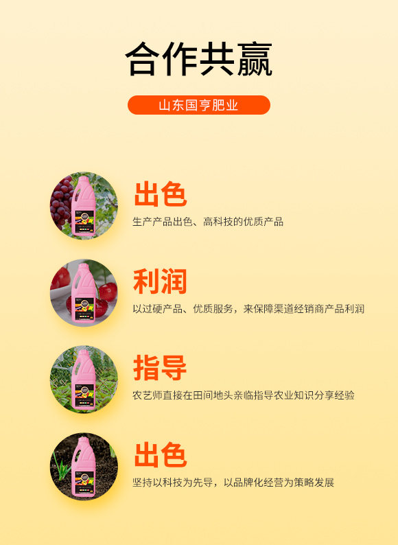 公司緊隨市場變化,關(guān)注肥料高新科技的發(fā)展趨勢,在國內(nèi)市場銷售的同時,也積極出口國外貿(mào)易。公司現(xiàn)有“國亨”“ 田園壯”兩大品牌,依托強(qiáng)勢的服務(wù)和強(qiáng)大的品牌理念,公司在不斷發(fā)展壯大。一直以來,公司總是處于時代的前列,超前發(fā)展的思想,始終占領(lǐng)市場競爭的至高點。