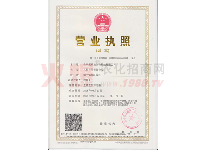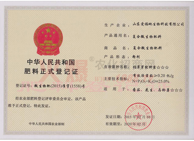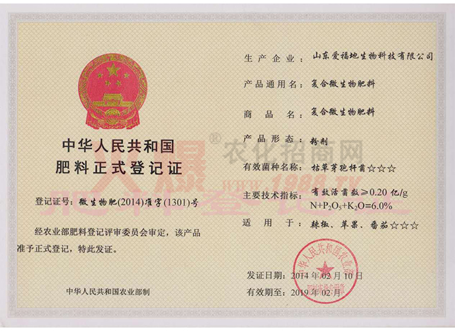 證書名稱:肥料正式登記證 發(fā)證機(jī)構(gòu):中華人民共和國(guó)農(nóng)業(yè)部