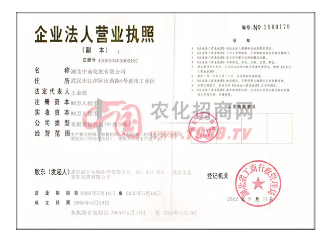湖北中南化肥有限公司成立于2005年12月。中南化肥有限公司由美國S.K.X等中美兩國高科技企業(yè)合資興建,由武漢市批準、湖北省工商行政管理局注冊登記的外資企業(yè)。中南化肥公司吸收了包括美國農(nóng)業(yè)博士、國內(nèi)農(nóng)業(yè)大學和科研單位的農(nóng)業(yè)教授、研究員和高級農(nóng)藝師在內(nèi)的一大批國際化肥方面的高級技術(shù)人才。中南(國際)化肥有限公司為中國化工學會化肥專業(yè)委員會團體會員,華中農(nóng)業(yè)大學教學實習和科研成果轉(zhuǎn)化基地。