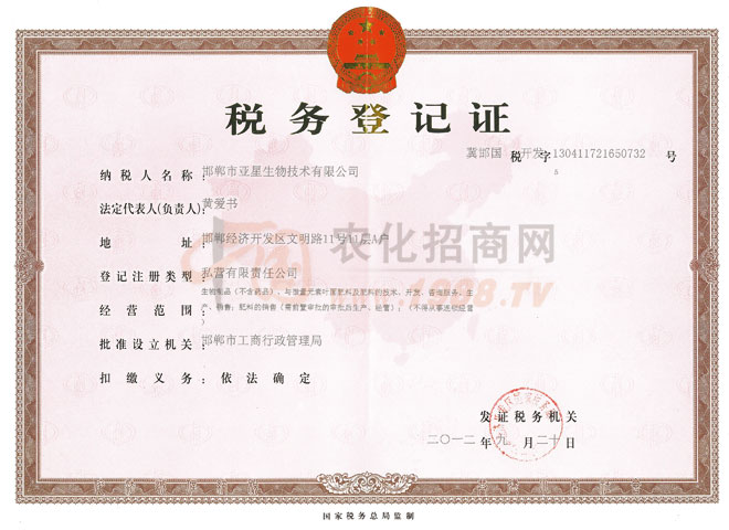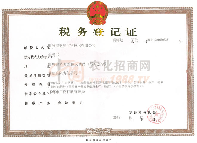 證書(shū)名稱:稅務(wù)登記證 發(fā)證機(jī)構(gòu):邯鄲市工商行政管理局